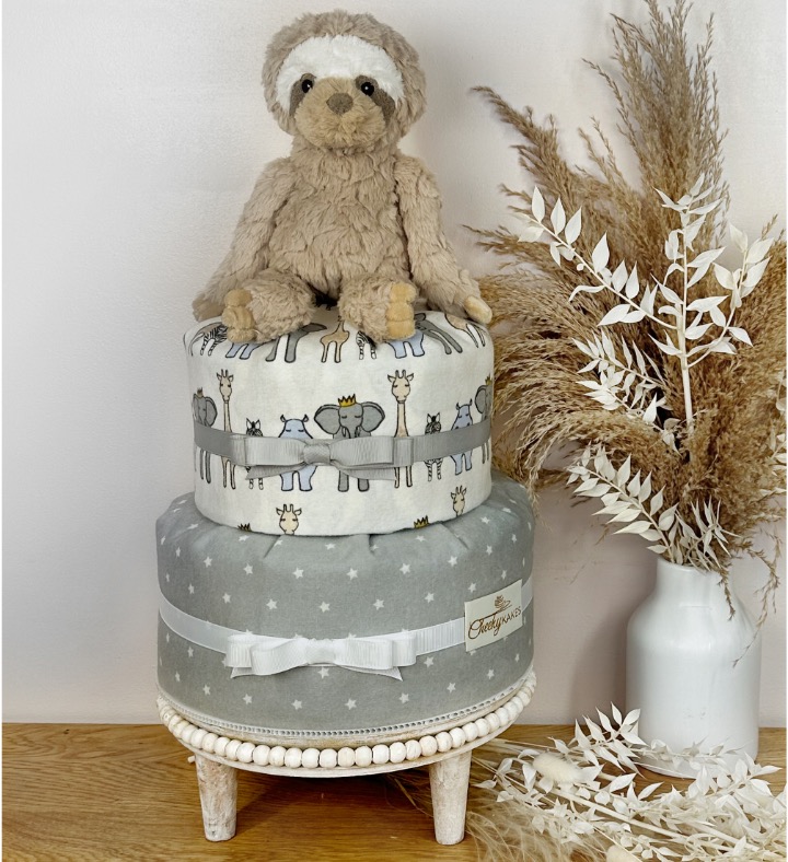 A modern diaper cake that turns practical baby essentials into a thoughtful gift. Designed with Huggies® diapers, blankets, and a plush animal topper, this is a stylish, memorable way to give something useful new parents will love.